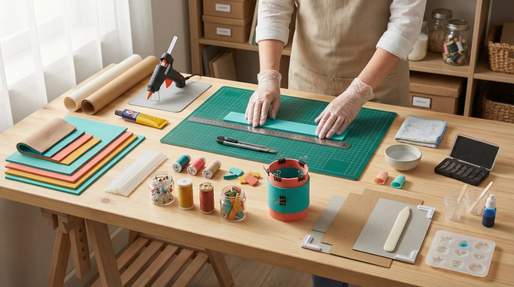 Comece reunindo EVA 2mm ou 3mm, cola quente, cola de contato, estilete afiado, régua metálica e base de corte. Esses itens formam a base para a maioria dos projetos rápidos.