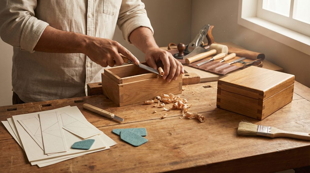Um passo a passo eficiente exige espaço. Organize sua bancada separando uma “zona suja” (para colas, tintas e lixamento) de uma “zona limpa” (para montagem final e embalagem). Isso evita manchas acidentais em peças quase prontas. Mantenha um caderno de anotações ao lado: registrar as medidas que deram certo ou as misturas de tintas utilizadas permite que você replique o sucesso em projetos futuros ou escale sua produção para vendas.