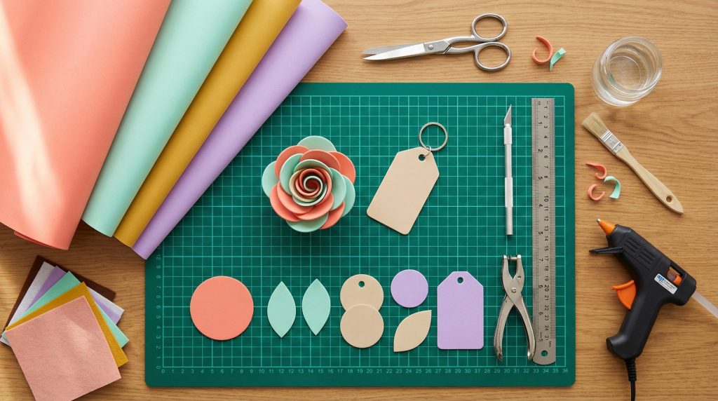 Material padrão: folhas de EVA, cola quente, argolas para chaveiro, tesoura, estilete, marcador para riscar, verniz acrílico para acabamento. Esses itens cobrem a maioria dos projetos rápidos.
