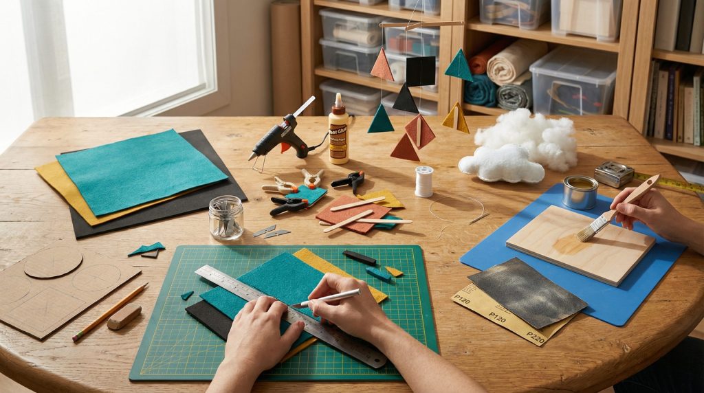 Para feltro: folhas de 2–3 mm, linha de pipa ou nylon para costura à mão, agulha, enchimento de fibra e cola quente. Para madeira: tábuas finas (3–6 mm), lixas P120/P220, cola para madeira e verniz acrílico.