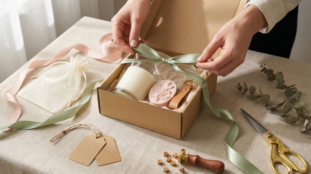 Caixinhas kraft, saquinhos de tecido e papéis texturizados são econômicos e combinam com estética artesanal. O acabamento faz a diferença: fitas, carimbos e selo de cera agregam valor.
