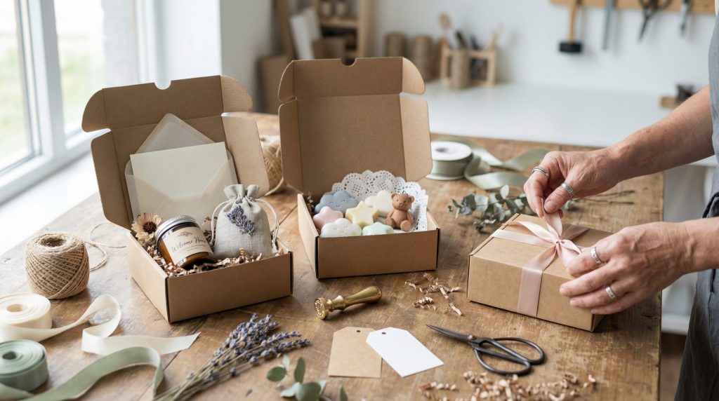 Para personalizar: adicione etiqueta com data e mensagem curta. Use saquinhos de tule para itens frágeis e caixas pequenas para composições mais sofisticadas.